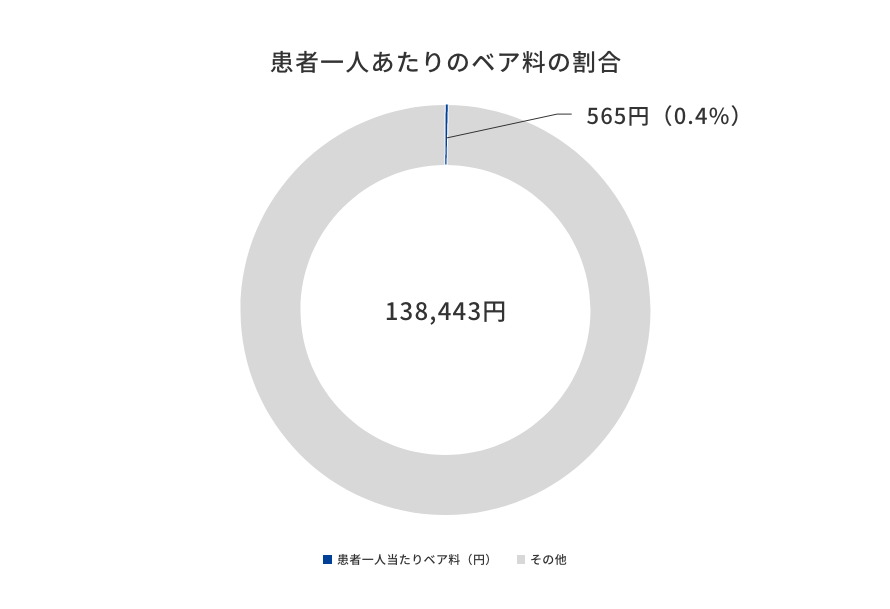 患者一人あたりの医療費としては年間で138,443円、このうちベア料算定患者に限定した際のベア料の割合は0.4%となり、金額にすると565円となりました。(図1)