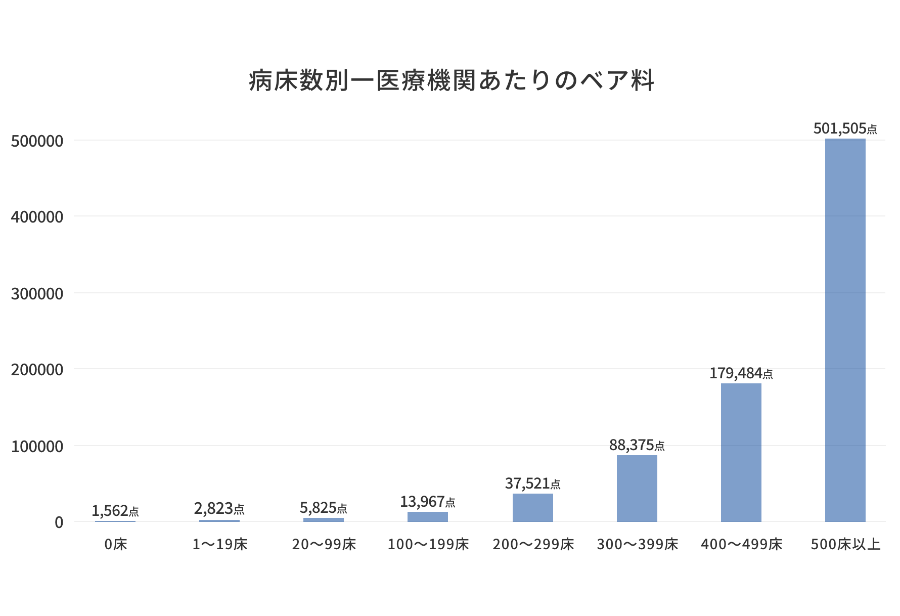 特に病床数が多くなるほどその傾向は顕著に見られ、300~399床では88,375点、400~499床では179,484点、500床以上では501,505点となっています。